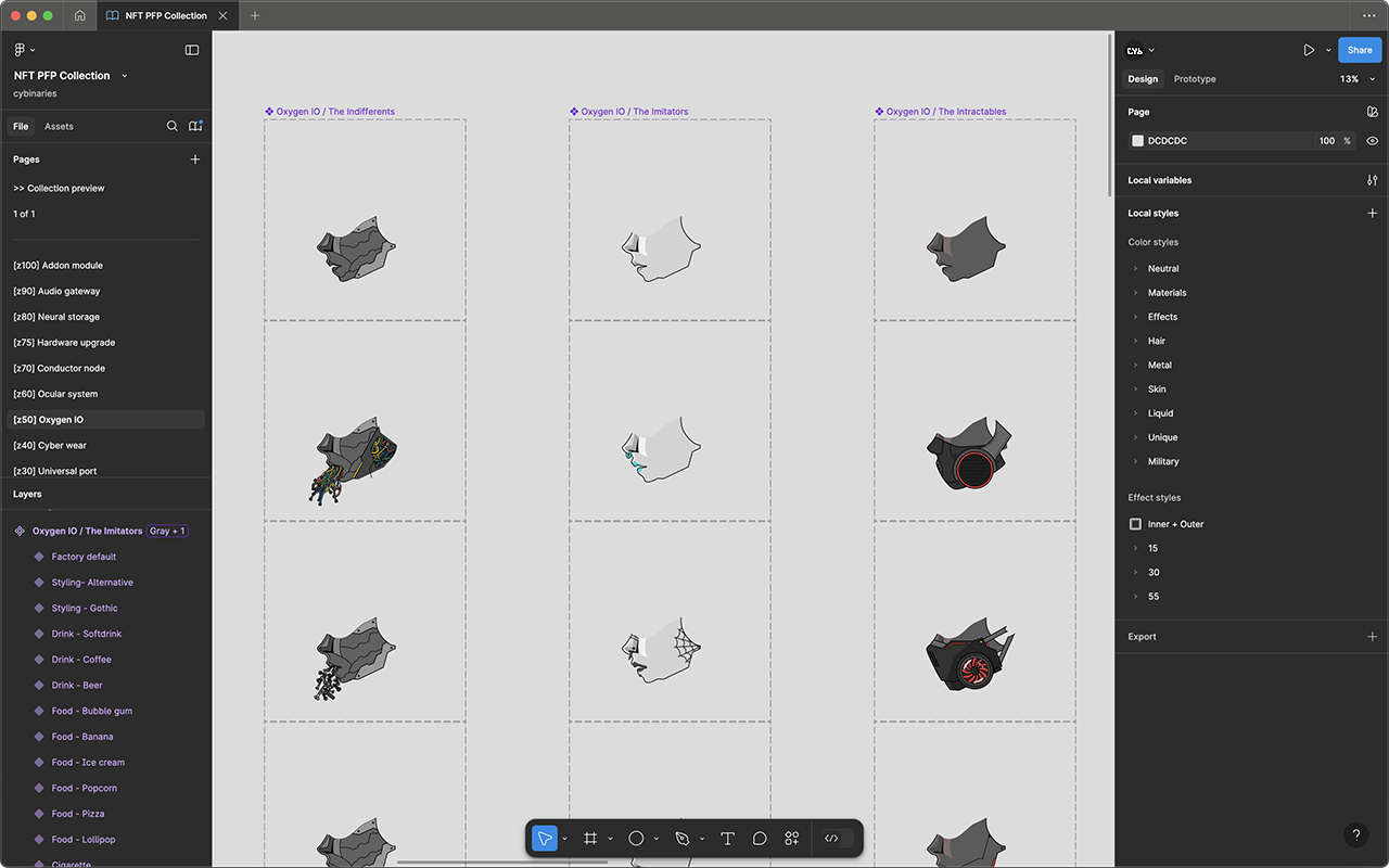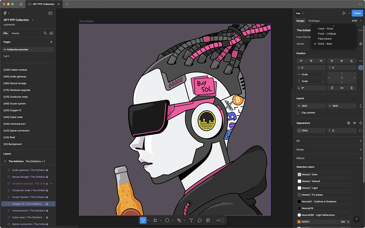 The three cybinary classes are build with figma components for each trait. Colors are organized in figma variables to ensure a consistent appearance throughout the entire PFP collection.
